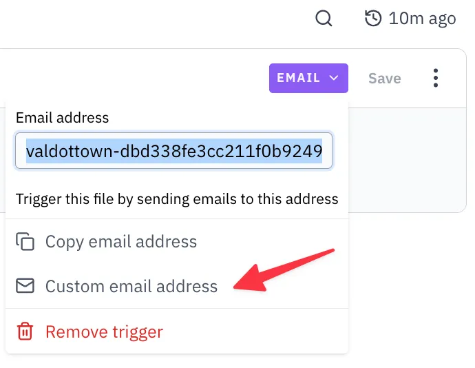 Section titled “Custom email address”Similar to HTTP endpoints, you can set a custom email address by clicking on the Email trigger and selecting Custom email address.